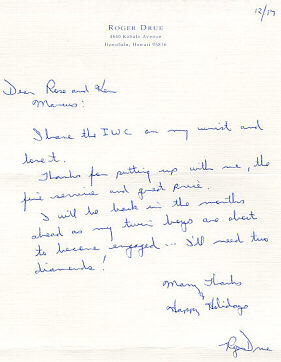 Dear Rose and Ken Marcus: I have the IWC on my wrist and love it. Thanks for putting up with me, the fine service and great price. I will be back in the months ahead as my twin boys are about to become engaged...I'll need two diamonds! Many Thanks & Happy Holidays Roger Drue |